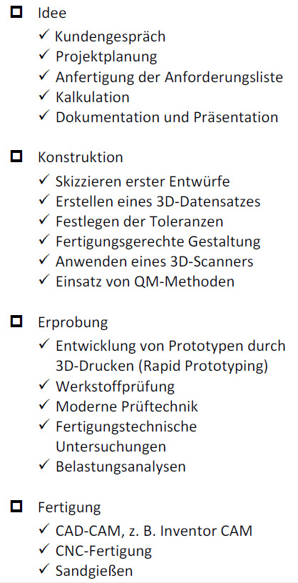 Am Anfang des Prozesses werden die Anforderungen an ein Produkt in einem Kundengespräch geklärt und eine grobe Projektplanung schließt sich an. Nachdem dieses dokumentiert wurde, werden die Entwürfe des Produktes anhand von Skizzen erstellt, und in CAD-Programmen in 3D-Modelle umgesetzt.